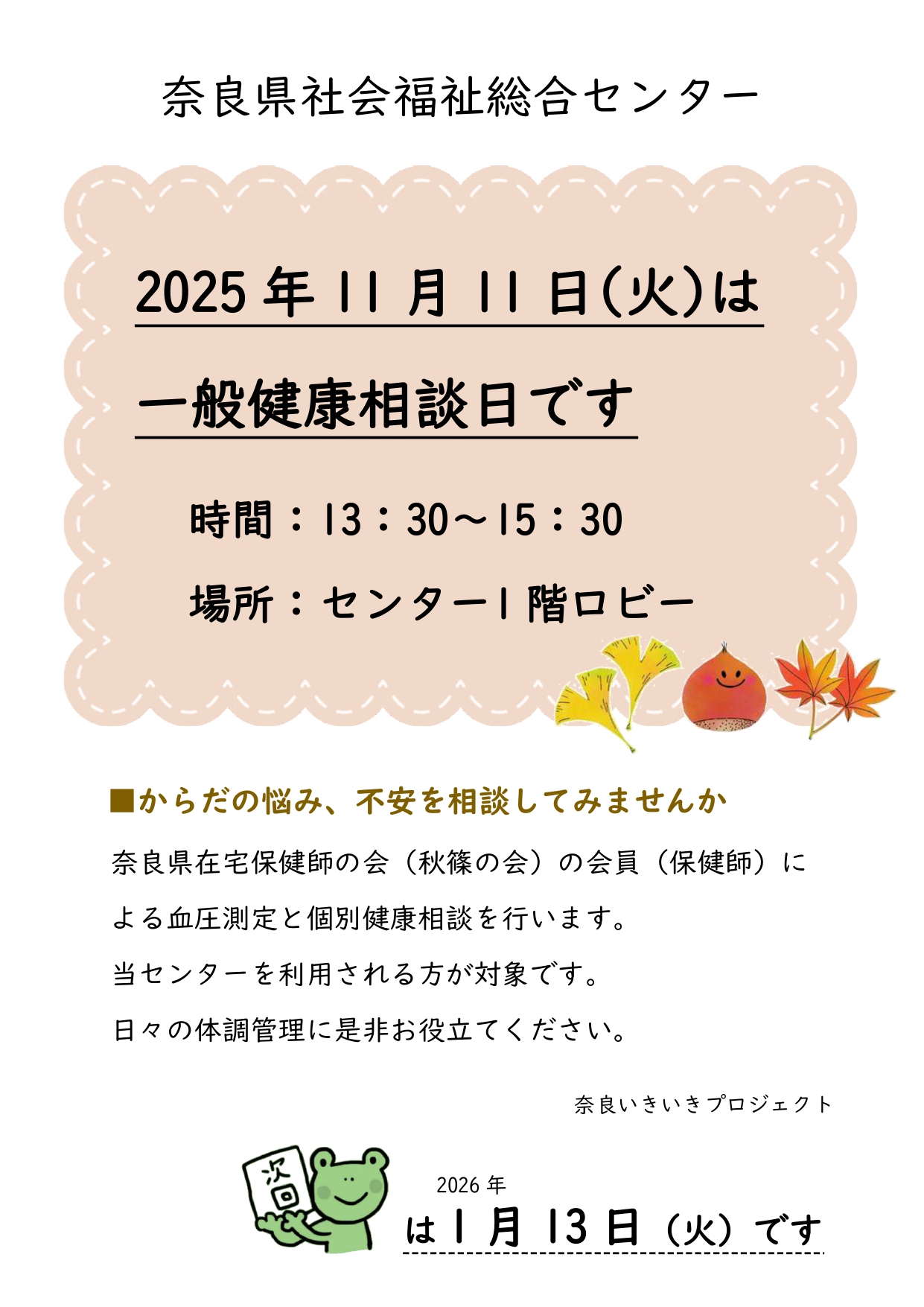 奈良県在宅保健師の会(秋篠の会)の会員(保健師)による血圧測定と個別健康相談を行います。